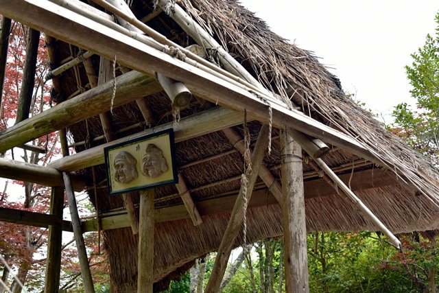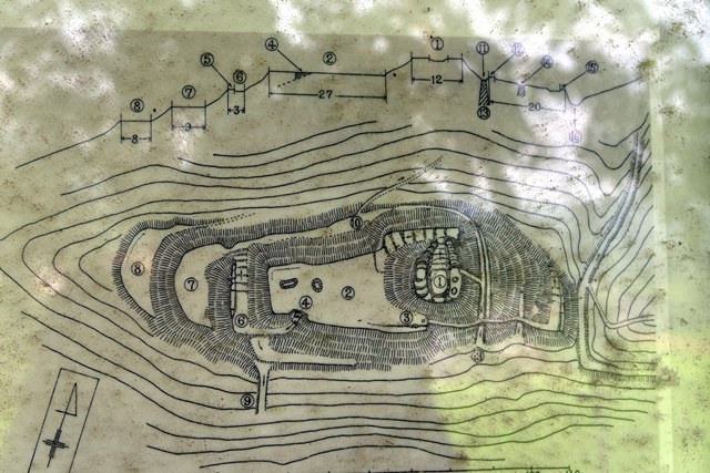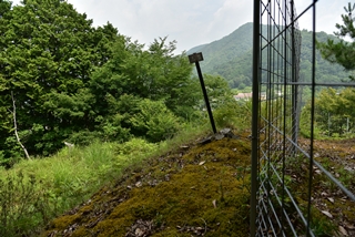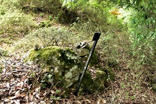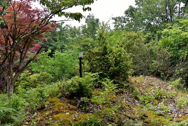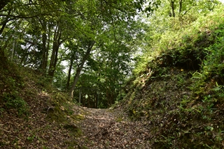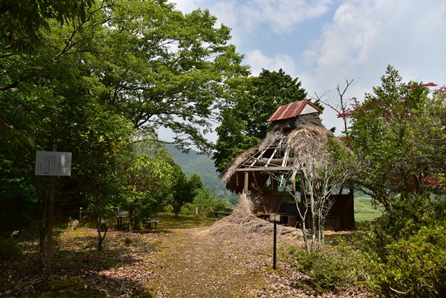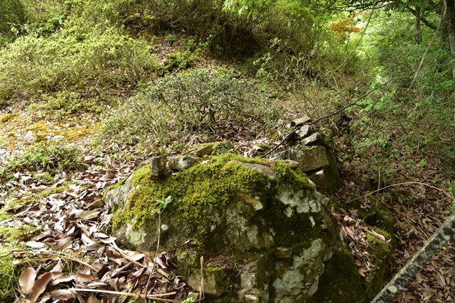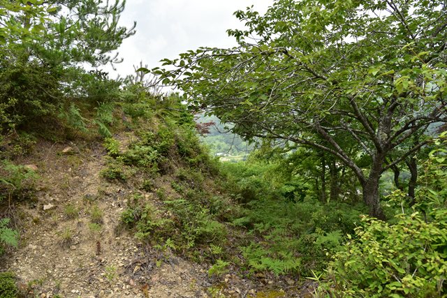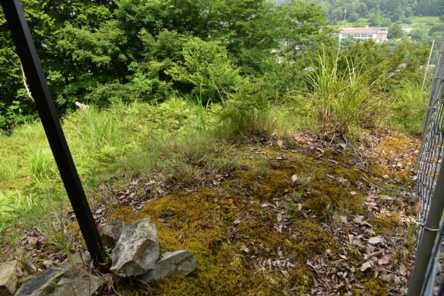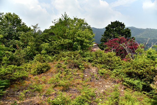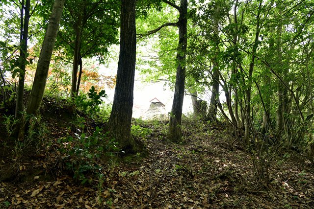 麓の説明板のところから登ります。尾根まで登ると大きな切通し状の道になり、往時は堀切だったものです。右手に登ると左からすぐに主郭に入れますが、右手には土塁を伴う堀切があります。(訪城には草木に埋もれ見えにくかったで。) その先に砲台のごとくに盛り上がる土壇があります。城域のど真ん中であり、櫓台?とは少し違う感じがします。主郭には南東側に石積み痕跡があり、西端に土塁があります。また、南西側に「虎口」の標識、その下、獣除けフェンスに「竪土塁」の標識がありますがよくわかりません。 主郭内に茅葺の東屋が建ってますがほぼ倒壊しています。平成三年(1991年)、助成を受けて整備されたようですが、維持の難しさという事なんでしょうね。