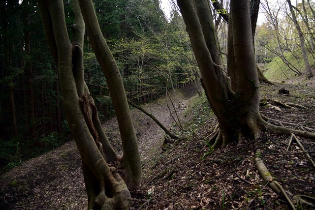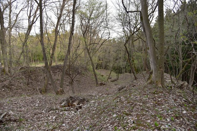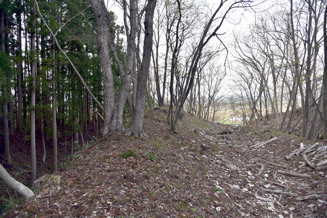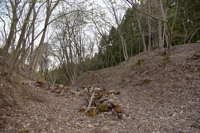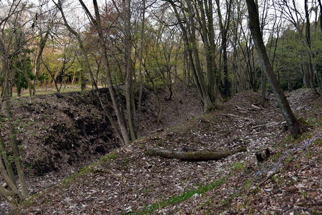 巨大な二重空堀、うまく二重の堀を同時に明瞭に見える形で写真が撮れませんでした。それだけ幅があって高くて巨大です。城跡としてはすごい遺構でした。二重空堀には圧倒されます。いいものを見たという感じです。日没近くに来たため、川崎要害、小野城など近くの城跡には行けませんでした。
