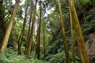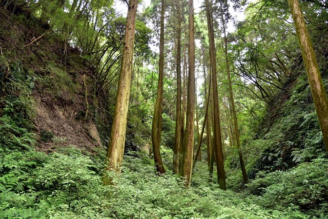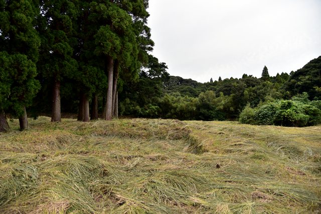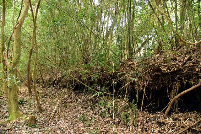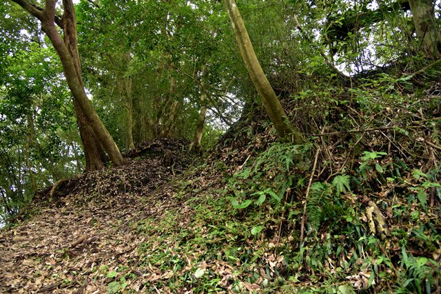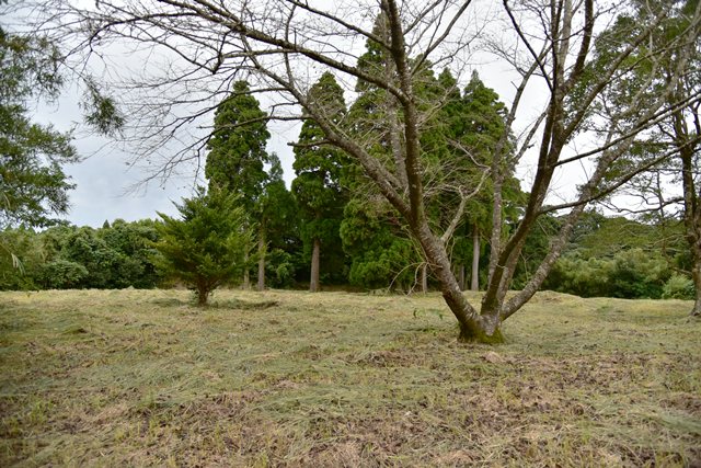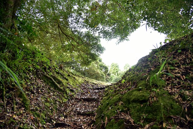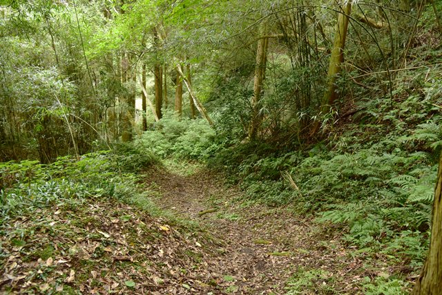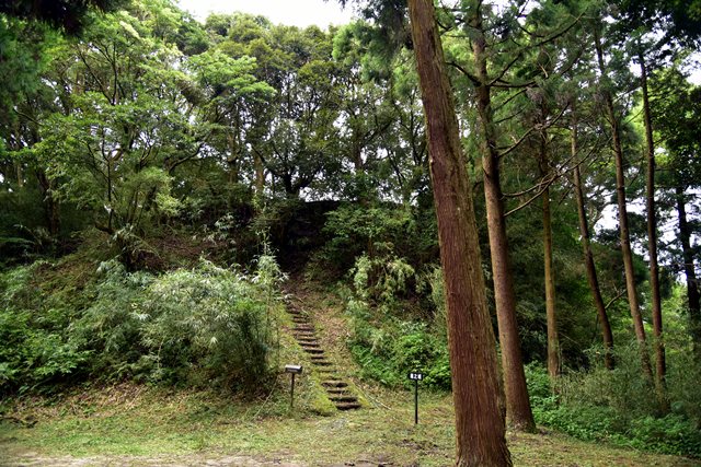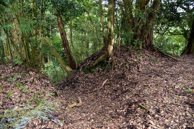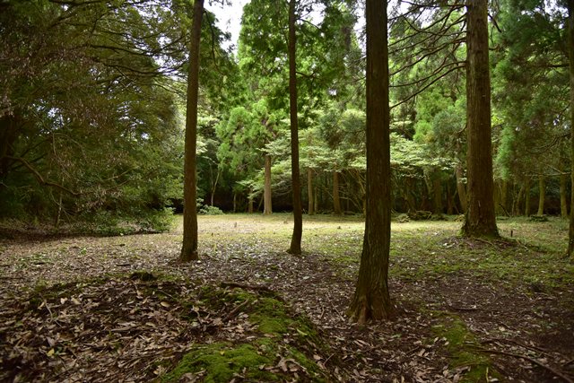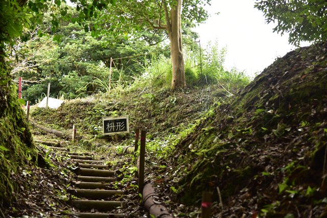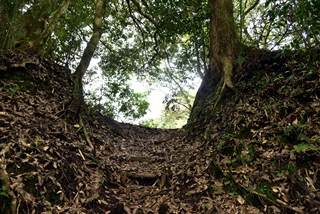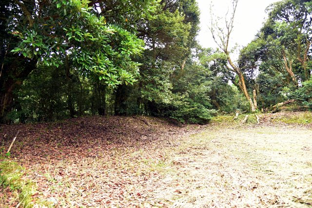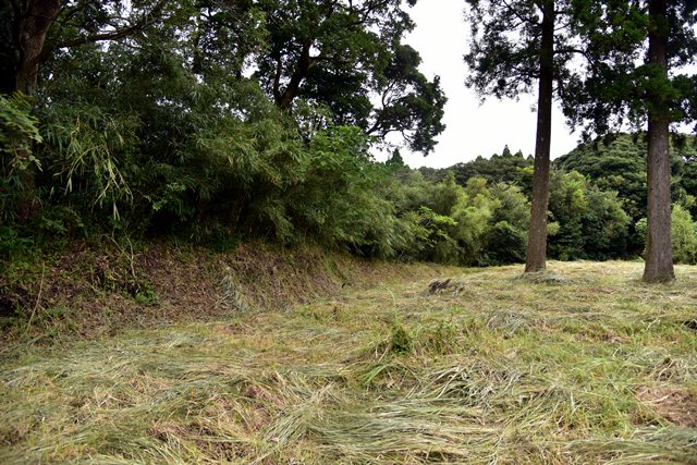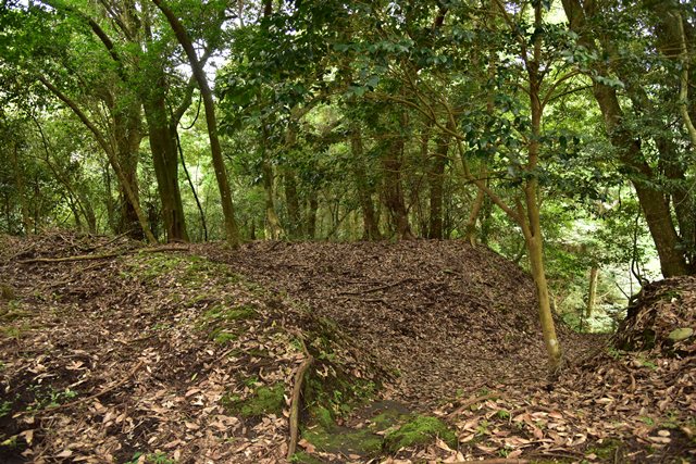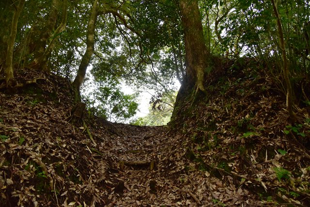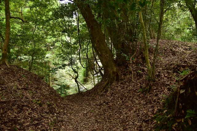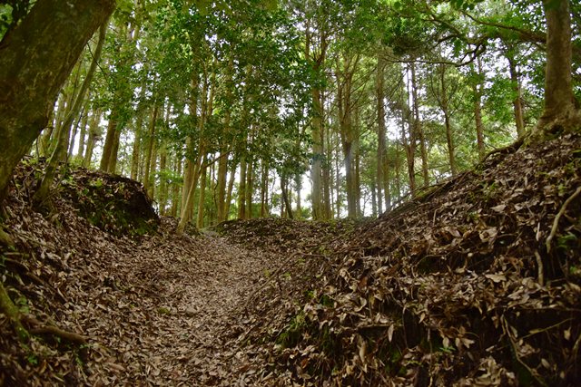 主郭(本丸)の北西下に大きな駐車場があります。ここに説明碑もあり、この駐車場の約200m手前、主郭(本丸)と東ノ城の間に入る道がありますので、ここに入って行きます。この遊歩道も往時は空堀だったようです。東ノ城の下を越えると左手にこれぞシラス台地の堀と言う感じの垂直の切岸で高い(深い)空堀が見えます。ただ、大木が何本かあるので見通しはやや悪いかな。