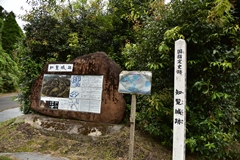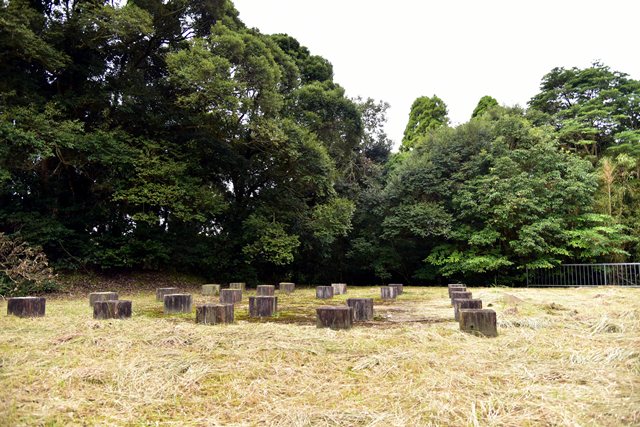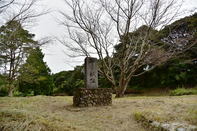 主郭(本丸)・蔵ノ城へ向かう登城道は枡形と表記されている箇所があります。確かに曲がってはいましたが・・・。主郭(本丸)と蔵ノ城の間の鞍部の郭にでます。この郭はただっ広く、草木もほとんどない広場のような状況です。数年前の豪雨で主郭(本丸)の斜面が崩れた先の資材置き場にでもなってたんでしょうか? ここからまずは主郭(本丸)へ登ります。右手へ登り、途中から左手に塹壕のような道を登り、最後は枡形の虎口を抜けます。主郭(本丸)に入るとすぐに城址碑が立っています。主郭(本丸)は非常に大きな空間でした。草刈りはされているようなんですが、伸びた草をなぎ倒してるという感じで郭面が見えない状態です。北側に四角に窪んだ箇所があるのですが、なんだろう? 北端には土塁が延びていました。 先ほどの鞍部から主郭(本丸)の反対側へ登ると蔵ノ城です。周囲には低い土塁があり、発掘調査でわかった建物跡の柱表記されてます。