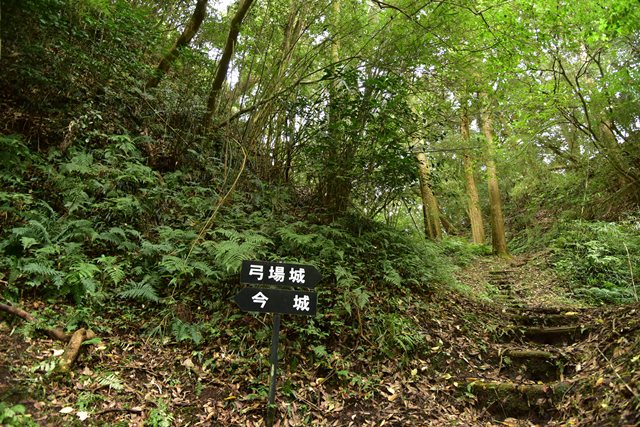 この深い空堀を越えると左手に弓場城と今城の登り口がありますが、これは後で。そのまま進むと右手に主郭(本丸)っと蔵ノ城への登り口があります。今来た道はそのまま進むと蔵ノ城と弓場城の間の深い空堀になり、その先は式部殿城方向になりますが、草木も多い状態でした。