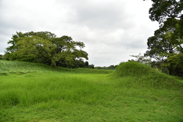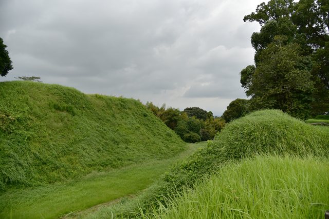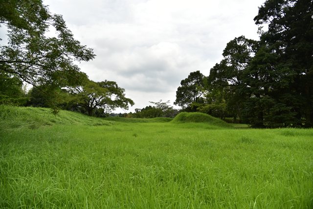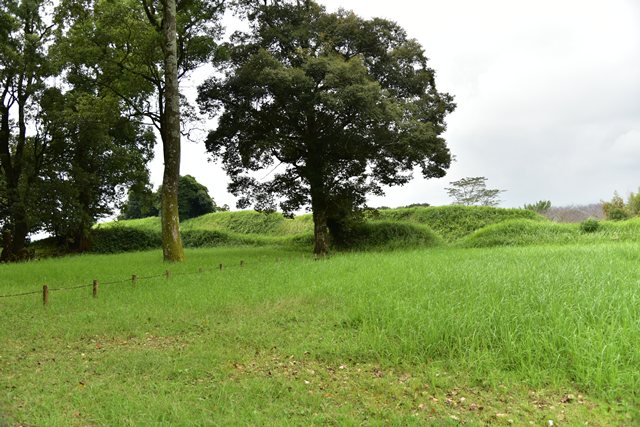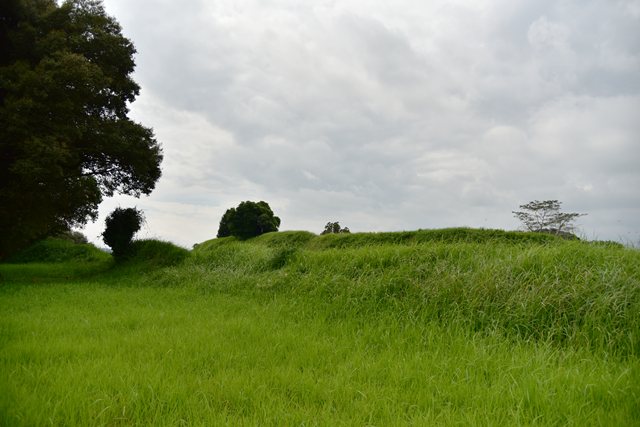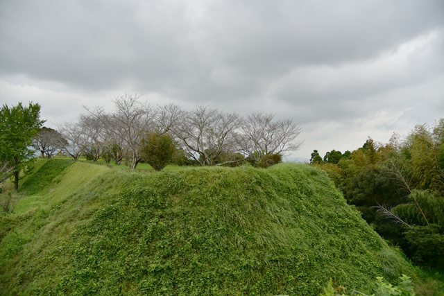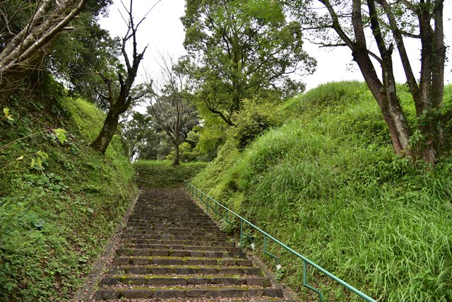 今回の南九州の城巡りでなんか初めてしっかりと群郭式の縄張りを見た感じがしました。志布志城や知覧城は堀はさらに深く斜面は鋭いのですが、木々と藪が邪魔して見通せなかったんですが、都於郡城は、草は膝まで一面覆ってましたが、見通しがきいてしっかり形が見えたんでよかったです。主要部郭群周辺には出城の前ノ城、東ノ城、日隠城、向ノ城、南ノ城があります。