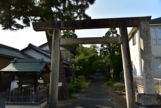 A羽島市福寿町本郷 B神明神社 名神高速自動車道の岐阜羽島インタを下り、岐阜羽島インタ口の信号を左折し県道46号線に入ります。約1.5km先、福寿町浅平3丁目の信号を左折し県道18号線に入ります。約1.5km先、羽島大橋東の信号を右折し、約100m先左手の神明神社が城跡です。遺構はない感じです。境内に城址碑と説明碑がありました。 |