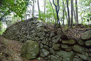 旧の野洲・栗田郡内最大の山城です。と書きましたが、今まで何度かこの城を訪れましたが、山頂部周辺しか行っていませんでしたので、城山山頂の遺構を見ててもそんな気はしてませんでした。以前から山頂東側に郭群があるのは資料で知ってましたが、藪状態で入っていませんでした。2007年11月に思い切って入ってみましたら、ほぼ完存する縄張り、大手道、多数の石垣の残存などなどが目の前に現れ、「すごいぞ!小堤城山」と言ってしまいました。「中世の城は山頂中心」に固守してしまい、東側山腹の郭は大した事はなかろうと思っていたのが間違いの元でありました。 さて、城跡ですが、まずは【山頂部】です。 【山頂部】 城山山頂を山頂郭と便宜上呼びます。ここを頂点に北への尾根上に二つ程度の段郭があります。登城道を登って来ると最初に小さな祠があります。ここから山頂郭までの段に石垣の痕跡が残ります。この石の中には矢穴が残っている大石もみられます。また、東側斜面にも石垣が僅かに残っています。斜面に上段の郭に降りる道ができています。 さらに山頂郭の南面下の斜面(古城山へ下りて行く途中)にはわりと大きな規模で石垣が残っています。この石垣の形状と山腹の郭群の石垣は石の形状が違うように感じます。ここの斜面の石垣は薄い石垣を棒積みされているように見えます。さらに、西側下の斜面(辻町方面へ下りる)にも規模の大きい石垣が残っています。この石垣と南側の石垣とは少し形状が違い、東側山腹の上段の郭の虎口の石垣に似ています。山頂郭を南側へ30mほどの崖をロープを使って降り、尾根を少し進むと堀切があり、そのまま尾根沿いに古城山に行けます。ロープで降りたこの尾根の北側斜面にも大石の石垣が残っています。 【主要部】 大きな郭としては四つあり、便宜上、上段の郭・東端の郭・東尾根の郭・主殿の郭と呼びます。 <上段の郭> <東端の郭> 山頂郭からロープで降りた地点から山の斜面に入ります。50mも進むと上段の郭に至ります。東側に櫓台であったろう大土塁が残ります。その先、櫓台から東側を少し降りたところに堀切があります。この堀切面には郭側に長い石垣があります。石垣は小さな石が積まれていますが、その中に一つだけ矢穴のある石がひとつあります。この郭を東端の郭とします。この東端の郭は堀切面の石垣以外の他の三面にも石垣が残ります。 <東尾根の郭> 次に、上段の郭の櫓台の北側という位置に大きな堀切を挟んで東尾根の郭があります。東尾根の郭には主殿の郭(主郭)から堀切からの堅堀を登って行けます。上段の郭の北側には平虎口があり、ここに人頭程度の石で積まれた石垣が4段10m程度残っています。この平虎口から斜面を10mほど下りると主殿の郭です。この斜面にも石垣・石段が残存しています。上段の郭と東尾根の郭の間の堀切で、いまでも明瞭です。ただ、主郭から堅堀を登って堀切から東尾根に入るという構造そのものはおかしいものです。元々は東の尾根があって、その後主郭が造営されたんでしょうね。東尾根の郭の北側にも堀切があり、ここに城内で一番姿の良い石垣が残っています。この石垣の石は人頭程度で、8段10mほど残存していました。さらに東尾根の郭の東斜面にも石垣が残っています。東面下の石垣は大手郭の石垣同様の大きな石を使っていて、3段で30mほど残っていました。この位置は木が無かったら麓から遠望できそうで、見せる石垣ではないかと思います。堀切から主郭とは反対の岩盤の堅堀を下りていき、途中で右手に曲がると東端の郭(堀切の石垣)の所に行けます。 <主殿の郭(主郭)> 主殿の郭(主郭)と上段の郭の城道は石段であったようです。主殿の郭(主郭)はこの城では一番広い郭です。下から来た大手道は主殿の郭(主郭)の北側下で急な坂を登り、主殿の郭(主郭)下で右手に折れ、さらに再度左に折れて、この主殿の郭(主郭)の北西面下、スロープのところに3段20mほど石垣が残っています。この石垣は上段の郭の石垣より明らかに大きい石を使っています。この側面の石垣を見ながらスロープを登って主殿の郭(主郭)に入るようになっており、大きさ、防御性からも中心の郭であるとは思われます。ただ、上にも郭があり、居住性のある郭であるため、戦闘的な主郭というより主殿と言ったほうがしっくりくる感じです。(麓からここに建っていた殿舎を見上げる事を想像するとそんな感じに思えました。) 【大手道】 東尾根の郭から主殿の郭に戻り、主殿前の大手道がクランク状の箇所の西側に張り出した郭があります。この先端は15mほど落差があり、下に大手郭になります。この張り出し郭からは麓側からの大手道が遠望できるはずです。大手道は主殿の郭(主郭)前から直線的に急坂になっています。別に平行して迂回の道もあります。こちらの道は迂回する分なだらかです。大手道の東の山側には石垣の痕跡があまり無いですが、張り出し郭側には石垣が残存しています。この坂はまことに