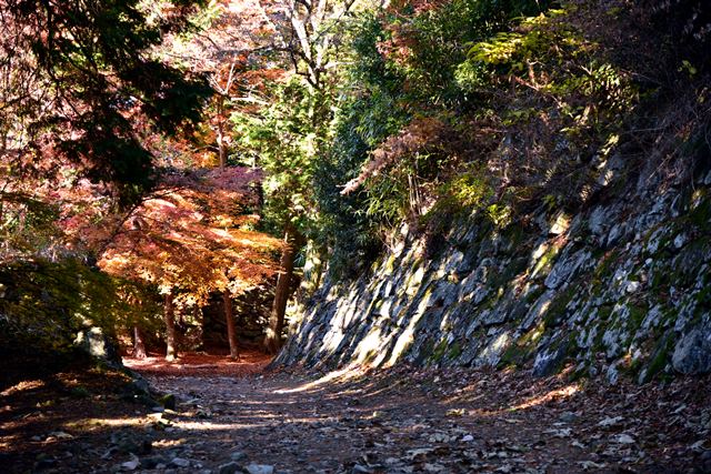 本丸北門から搦め手門を越えて八角平・搦め手道方面へは1990年台までは出入りできましたが、今は本丸側からは通行止めになっています。この北門から搦め手門までは五つの折れがあります。通路の両サイドを石垣で固めています。途中から伝台所郭への通路と分岐しています。さらに、八角平から先の尾根にも枡形の虎口が残り、高石垣が残っています。その先の尾根には赤色立体図で多くの郭跡が確認されています。さらに、搦め手道は搦め手門を出て、八角平手前で右手に下りていくようになってました。ここで右手折れて搦め手門の北側下を尾根筋に進むと米蔵、硝煙蔵、三の丸下高石垣、堀屋敷などが見られ、本丸南斜面にも石垣が累々と残ります。戻って、搦め手道を下りてすぐ大きな石積みの井戸(池)があり、これは石垣山城の井戸郭の原型ともいわれています。搦め手道側にも多くの郭、石垣がありました。麓には船着き場の跡と呼ばれる池も残ります。
