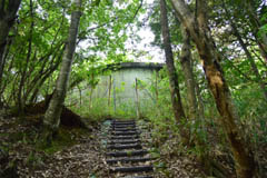 舞鶴若狭自動車道の綾部ジャンクションから綾部宮津道路に入り、さらに宮津天橋立インタから宮津与謝道路に入り与謝天橋立インターで下り、国道176号線へ右折します。約1.5km先消防署前の信号で左折し国道178号線に入ります。約12km先、日置の信号で斜め左の府道75号線に入ります。約1.5km先の左手上(府道が左カーブになる前)にタンクが数基あります。ここへのアスファルト坂道の入口隣に細道があり、登るとゲートがあってこれをくぐり、浄水場のフェンスに沿って登って行き、山に入ります。見上げると尾根先端が見えますが、ここからが東郭群です。なお、麓の浄水場の西側の墓地背後から道はあるのですが、約20mほどが相当な薮になっていて夏場はここを越えられないです。(冬場はわかりませんが)