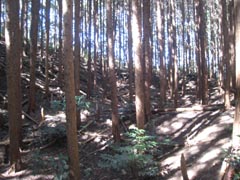 大和高田市の国道24号線と国道166号線の交わる東室の信号から国道24号線を南下します。18km先、東佐味の信号で右折し県道30号線に入ります。800m先の信号は直進ですが、右折すると県道30号線の旧道で高鴨神社に至ります。さらに800m先の大西橋西詰の信号で右折し、県道30号線新道に入ります。500m先が鴨神バス停です。バス停横の小道を登ります。道はU字の細い道ですが途中であぜ道を直進します。トタンとフェンスを越えて林に入ります。すぐに墓石?(石碑?)がありこの前を左折します。(夏場は藪状態です^^;)よく見ると道で、右回りで山を登ります。中腹の竹林の二股は右手、さらに尾根の下でまた右手です。最後はやや左手方向に登ると虎口ですが、右手方向に行くと下草の無い山の斜面に至り、ここを左手に登ると、主要部下の堀のところに至ります。ここを越え、登ると主要部の北東端の郭で、左手に行くと主要部虎口に至ります。