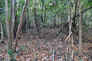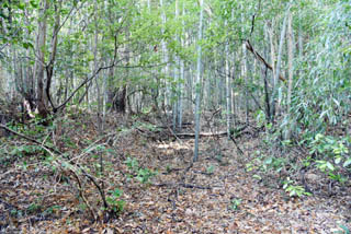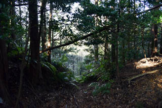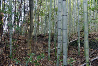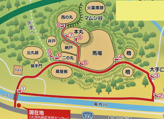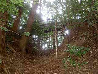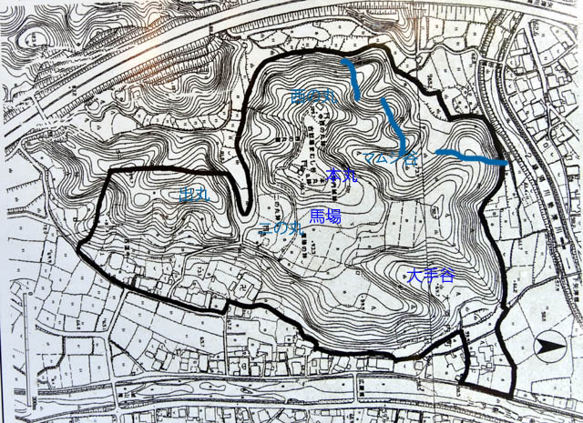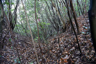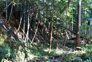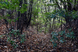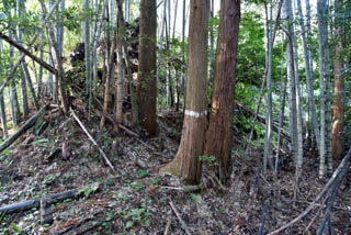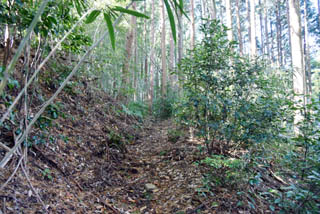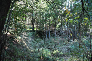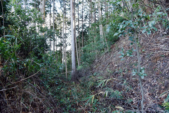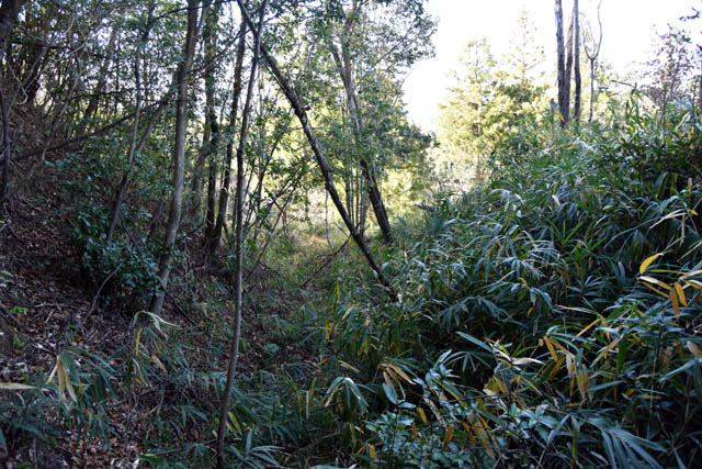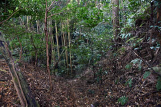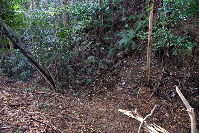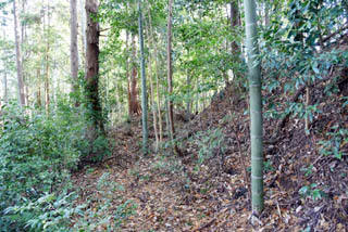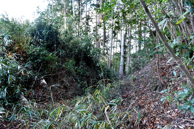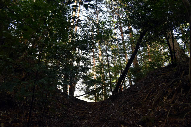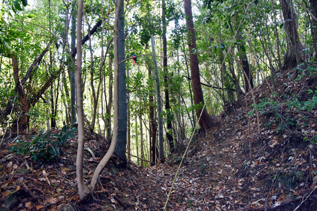【道案内】 伊勢自動車道松坂インタを下り、すぐの信号を右折し県道59号に入り南下し4.2Km先の三郷橋を渡ると国道166号線の信号で、これを右折し国道166号を進みます。(国道166号線は松阪市中心部の大黒田西の信号で国道42号線と分岐しから西に向かう国道です。)2.1Km先で広阪のバス停を越えたあたりで右折し阪内川を渡り西運寺前で右折した裏山が城跡です。 【訪城備忘録】 麓より進みますと右手に馬場を越えて台地上に登ると本丸に至ります。本丸は現在は神社で、本丸から二の丸を通り背後に廻ると西の丸との間に明瞭な堀切が残ります。これは深く明瞭な堀切です。この堀切から続く北側の谷はマムシ谷というらしい・・(コワッ) 西の丸の西側・北側の一段下に郭があります。この先斜面に堀切が1条づつあります。二の丸まで戻り、草の多い馬場と表記ある平坦地(ここは畑利用などが過去にあるため相当に改変されているようです。)を越えていくとさらに平坦地が続きます。やや左手方向に進むと浅い切通状の窪地を越え郭を越えるとこの城最大の大きさの堀切があります。この先は火薬庫という名前が付いた郭がありますが、藪藪で見ることができませんでした。大きな平坦地の反対側の端まで犬走りと言われる通路を通って行くと大手谷上の郭の至ります。ここは3段ほどあり大手へ横矢がかけられる郭と説明されるようです。 西蓮寺側から来ると最初に切通状態になっている堀切とその先に出丸と呼ばれる郭もあるようですが、こちらには行きませんでした。 【歴史】 応永二十二年(1415年)、北畠氏三代の北畠満雅が阿坂城に籠城した際に築城し弟の顕雅が在城しました。以後、顕雅の子孫の居城となり大河内御所と呼ばれました。永禄十二年(1569年)に織田信長の伊勢侵攻の際、北畠国司家八代の具教は本拠を多気からここに移しました。具教は信長の次男信雄を北畠氏の養子にして和睦し、信雄はここを居城としましたが、天正三年(1575年)に田丸城に移り、廃城になりました。 |
