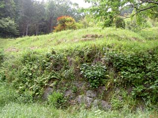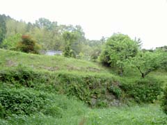 山が迫る高台の上に陣屋跡はあります。これは大島陣屋や則定陣屋と共通する立地です。陣屋主郭下斜面と虎口跡と思われる土塁の外側にも石垣が残っています。 |