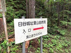 北陸高速道加賀インタを下り、熊坂の信号で左折し国道8号線に入ります、約3Km先の曾宇町の信号で右折し県道142号線に入ります。約2.5km先で県道142号線新道との交差点で左折します。約1km先日谷荒木トンネルの約200m手前で右折します。約600m先、日谷町の入り口付近で左折します。(日谷城の標識有:登城口まで900m) 約500m先で右折します。(日谷城の標識があります。) 約700m先の右手に日谷城登り口の標識があります。(城跡まで420m)