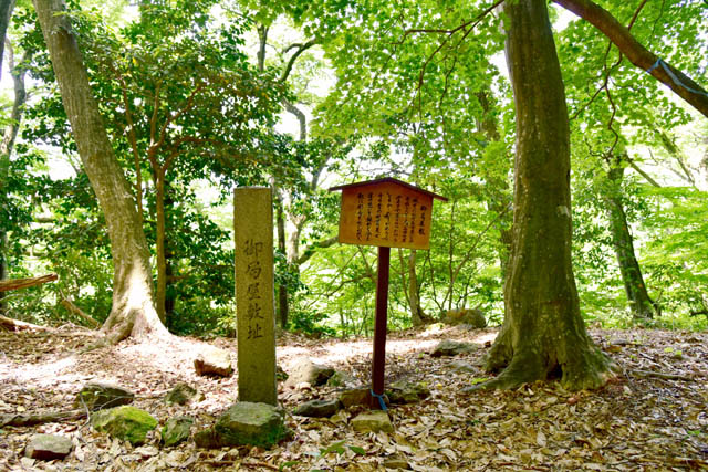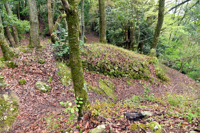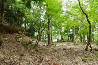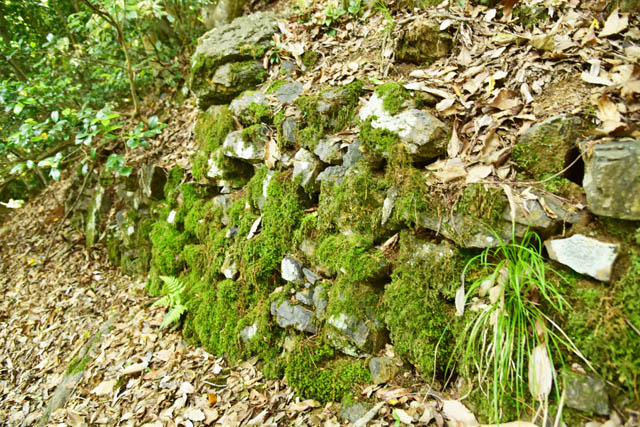 山王丸から岩場の急斜面を比高で50mほど下りる感じで、下りたところが六坊です。ここには領内の寺の分院があったようです。東側土塁があり、薮で分かりませんが東斜面には畝状堅堀があるようです。ここまで朝倉氏の改修の手が加えられたようです。 六坊を過ぎると右手へ行く道、斜め左手を登る道、戻る感じで谷に向かう道に分かれます。右手は月所丸、上に登る道は大嶽城、戻る感じは清水谷に向かう道です。 月所丸に行く道へ進むとすぐの右手に大きな堅堀があります。さらに進むと月所丸入口で右手に進みます。但し、まっすぐ行くと畝堀が並んでます。こちらの移動を阻止したかったんでしょう。 月所丸は二つの大きな郭からなり、各郭端は円弧状の土塁があります。尾根側の郭の土塁の先は高低差が大きな堀切にあり、さらにもう一条の堀切があります。ここまでの土塁を使っているのは主要部では京極丸だけです。ここも朝倉氏の構築と考えられます。月所丸は資料に名称としては無いらしく、発見された方が地名を持って命名されたとの事です。 この月所丸、軍艦の艦橋と舳先部分に見えてしまうんですよね。 月所丸の二重堀切を越えて尾根を進むとまた堀切が一条あります。この尾根道は越前忍道ということになるようです。しばらく行くと浄心平という平坦地で忍道はそのまままっすぐですが、右に折れて尾根を下ります。この坂は「克巳<こじき>坂」と呼ばれ、小谷城落城時、お茶々、お初、お江の三姉妹が落城前に織田軍に引き渡されたのでは無く、侍女に導かれこの坂を下りて逃げ、実宰院の長政の姉に匿われたともされます。この坂、相当に長い尾根斜面です。比高で200m以上あるかもです。この坂の途中に「本宮の岩屋」があります。ここは大和期に蘇我氏に敗れた物部守屋が隠れたとされます。このまま下りると西池です。西池の集落側には侍女の墓という言われる墓があります。この墓には天正元年の文字が刻まれてます。 |