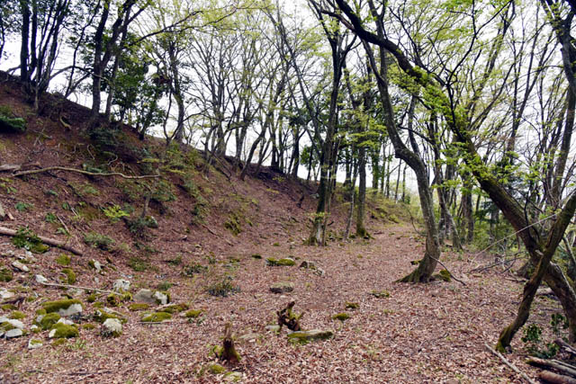 | 広い空間を千畳敷、一段高く砲台状を本丸と呼んでいます。 千畳敷には40年前ですと本丸を正面に右手に8本程度、左手に4本程度の山桜があって、最初は右側が咲き、遅れて左側が満開になってました。満開後に花びらが千畳敷を埋めました。それが見たさに結局40年も通ってしまいました。(笑) しかし、今は桜の木は腐ったりして伐採され右手に4本程度しか残っていません。また、桜の満開も昔は4月第三週でよかったですが、今は第一週目には咲いています。地球の温暖化を感じざるを得ません。千畳敷には礎石も残り、大きな建物が建っていた事でしょう。本丸には三階櫓が建っていたんじゃないでしょうか?石垣は本丸の千畳敷側に切岸の1/3程度が残り、側面の通路を狭める感じで飛び出している土塁の側面に残っています。 本丸背後、中丸との間に巨大な大堀切が横たわっています。今は千畳敷から本丸の西下を通り大堀切の西端を進み中丸の虎口に至るんですが、往時も城道としては同じじゃなかったのかな。 |
