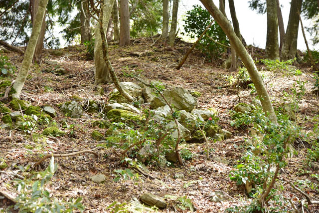 清水谷の道沿いの「水の手」と言う標識があります。ここから京極丸に向かって登ります。沢の右手を沢に沿って登って行きます。途中、竪堀があり、この右手を登って行きました。水源である井筒池と言うのがあったようですが、今は消滅している感じです。 中腹まで登ると突然しっかりとした石垣が現れます。この斜面遺構では最初の郭と石垣でした。水の手道を監視する郭のようです。(仮)水の手郭としておきます。郭面はしっかりとした削平され、そこそこ広い空間です。山側を見上げると斜面に二つの竪堀状が見えます。右手は怪しいですが、左手のものは竪堀だと思います。 水の手郭の北側からまた斜面を登ります。大きな段郭が連続である箇所に出ます。特に上の段郭は大きな郭です。段郭の切岸にも石垣の痕跡があります。さらに郭の北側の竪堀沿いの登り土塁状のところを登って行くと山中に大きな石垣が残っています。後で確認すると(通称)横掛道から見たら二つ下の段郭にあるものと思われます。石垣から上に登ると横掛道に到達しました。横掛道沿いの大きな郭です。「大野木跡?」という標識が木に括ってあしました。これの南側(京極丸の直下)に手書きの概略図がかけてありました。これはありがたいです。このまま南へ横掛道を歩いて行くと桜馬場、御馬屋の下の大竪堀側なんですが、いったん上に登ります。 京極丸の西下の郭(石積み桝形虎口があるところ)のさらに下の郭の西斜面下の石垣遺構があります。ここの規模も大きいです。残り方がちょうど菱形に近い形で残ってました。 |