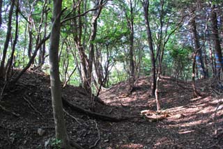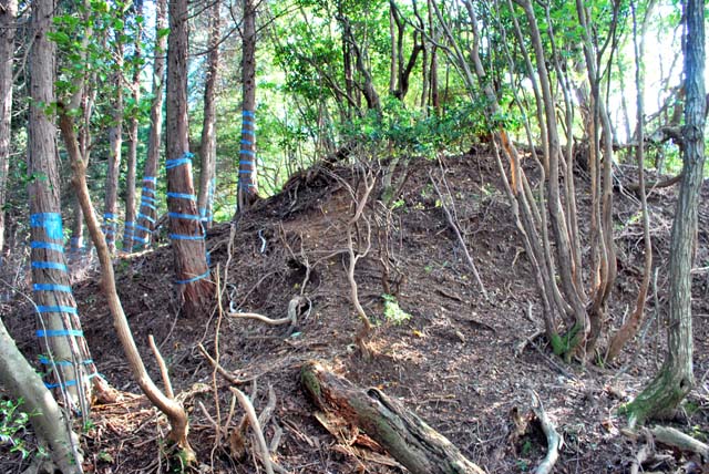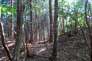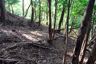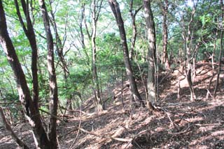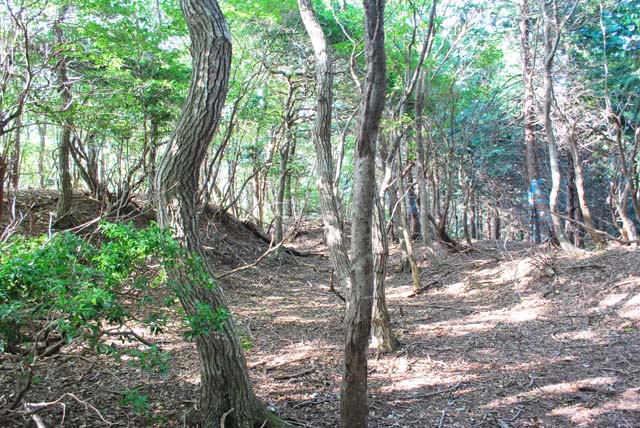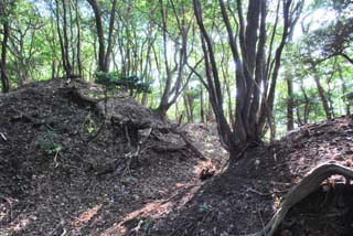 この城跡は明瞭な道が無いため迷いそうになります。 私は登ってませんが伊装冊神社から登るのも道が無いのと距離があるのできついとの事です。 私は行きは長比城の副郭の北側から急斜面を谷間で下り、そこから西に登ったという過酷なことをしてしましました。道的には道案内に書いたように長比城の西端竪堀の所からやや右手方向に下りて行き、尾根の鞍部から反対側の尾根を登って行くと比較的楽に城跡に行けます。 城跡は厚い土塁に囲まれた郭に東から登ってきた尾根側の平虎口と北側で西に向いて開かれた虎口があります。この虎口の土塁の上に城址碑があります。 虎口を出ると北に土塁、西に竪堀が落ちた虎口郭的な空間があります。導線は主郭虎口からU字に折れるように進み、城外への虎口を抜けるという形になっていて、城外への虎口を出ると道は左方向の北への尾根に繋がります。東斜面には竪堀が数条あります。虎口郭の土塁外側は薄い堀切(空堀)状の地形と坂土橋というかやや傾斜のある導線が認められます。その西側には竪堀が長く落ちています。 コンパクトながら折れが多用されていておもしろい城跡です。 |