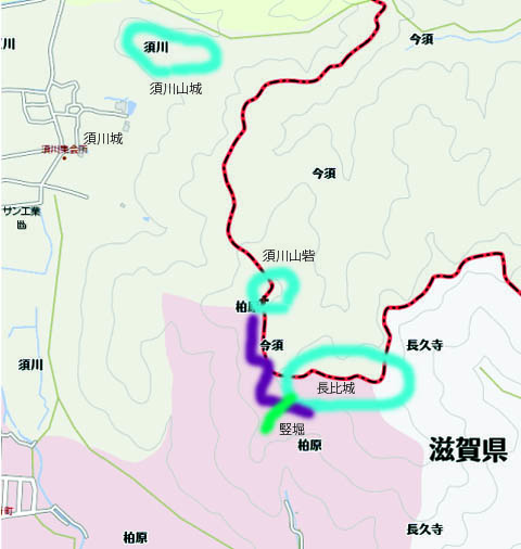 国道21号線の滋賀県と岐阜県の県境より手前1Km、柏原東の信号を北に入り、すぐJRの線路を渡ると道がT字ですのでこれを右折します。100m先左手に神明神社の鳥居がありますので、そこの側道を登り左手砂防ダム手前まで登ります。砂防ダムより100m手前左手を登ると秋葉神社があり、(神明神社は右手方向)この秋葉神社の祠の裏手に山道と尾根に登る道がありますので、この尾根道を登ります。長比城に到着すると西側斜面に竪堀が一条あり、その竪堀という標識の箇所を渡り、左手に下りて行きます。比高で30mほど下りて右手方向に行くと尾根の鞍部があります。 ここから反対側の尾根に登って行くと城跡です。 あるいは、西側の麓の須川集落にある伊装冊神社の裏手のフェンスから入り、尾根まで直登に近い道を行き、尾根を右手方向に来ると城跡です。 |