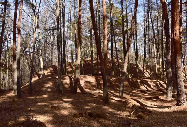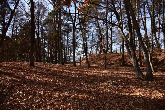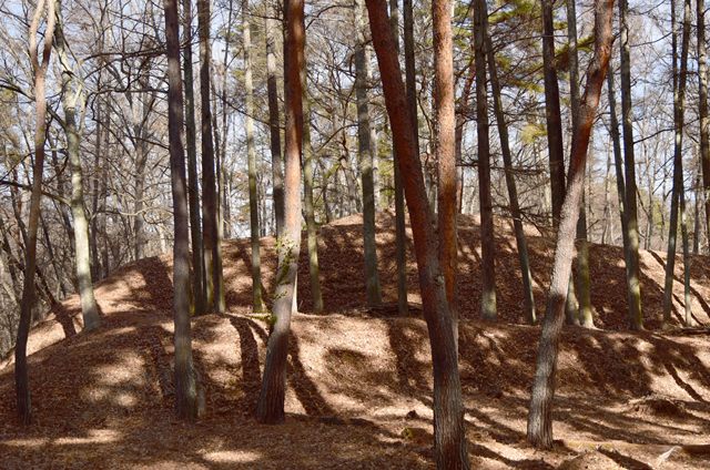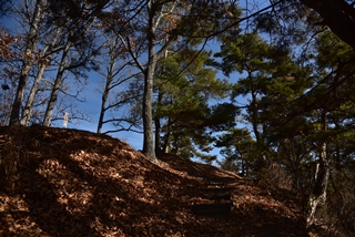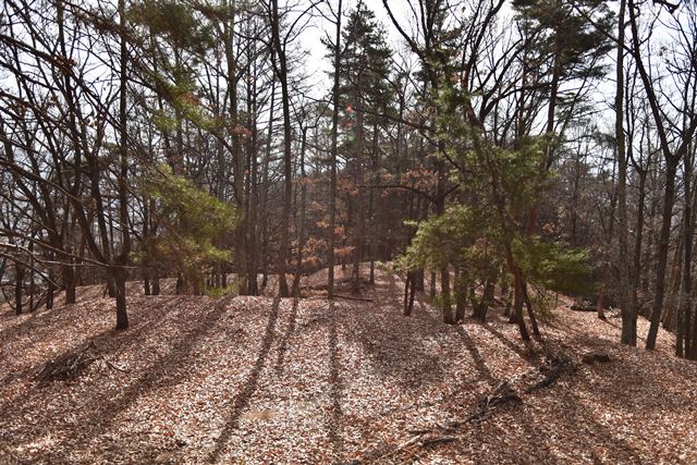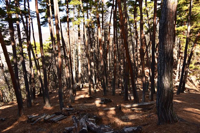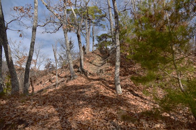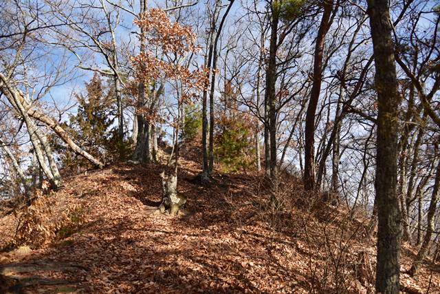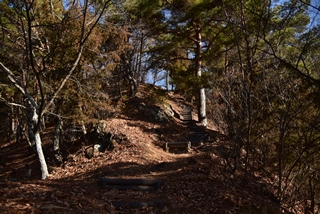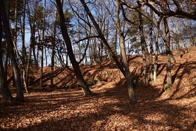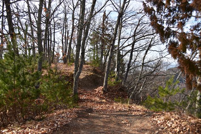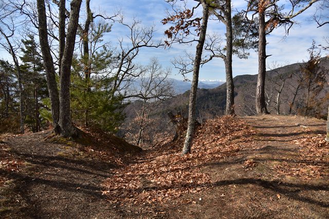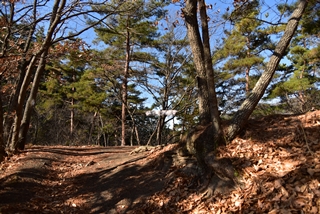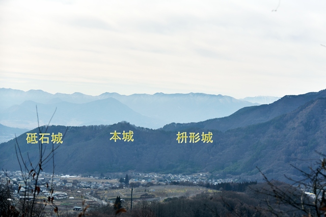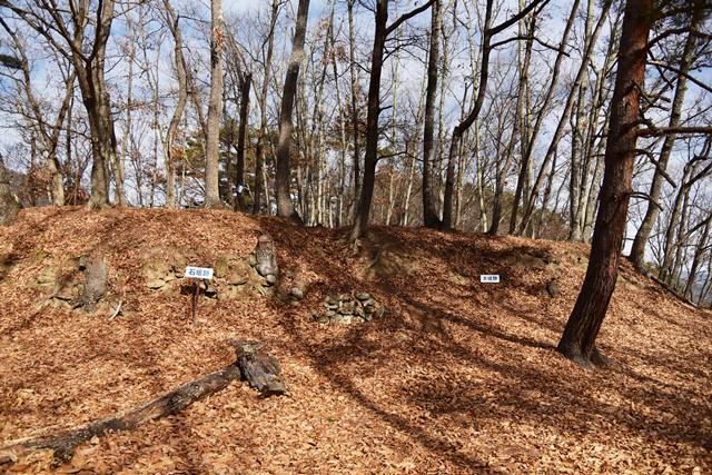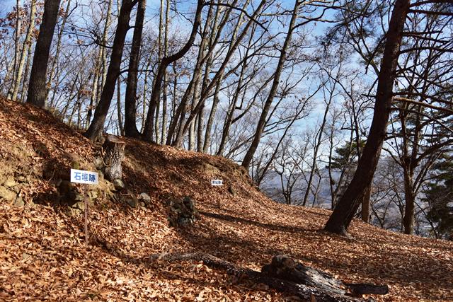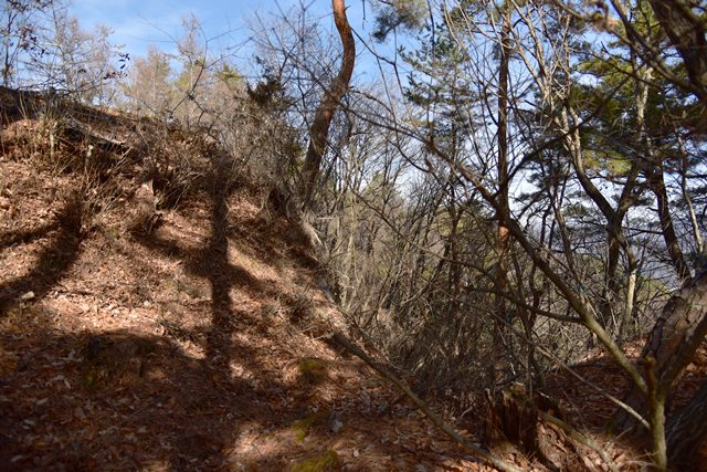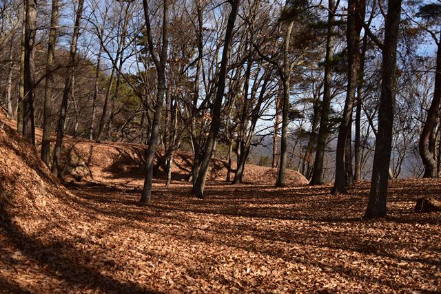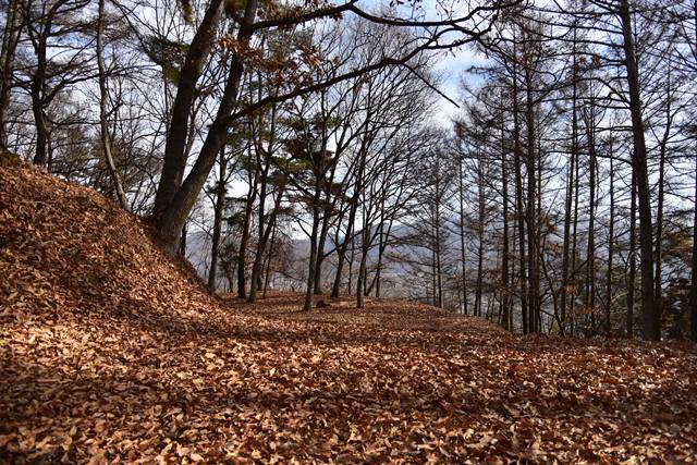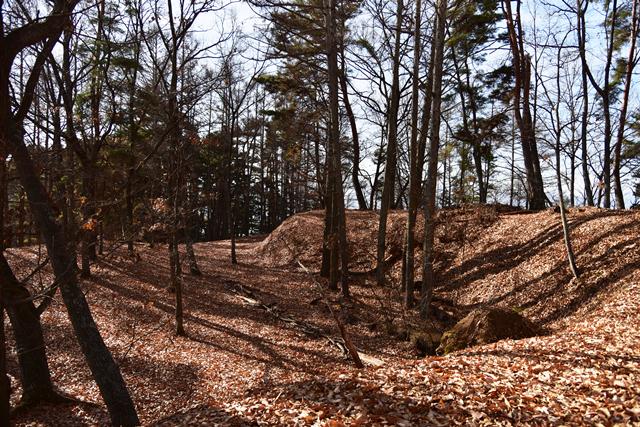 戸石城(砥石城)は砥石城、本城、枡形城の総称で戸石城(砥石城)と呼ばれ、本城が中心郭になります。麓より尾根まで登り右手に進み登ります。ちょっと長めの急坂を登りきると砥石城です。ほぼ単郭の郭で、東南側と北側に堀切が残ります。 東南側の堀切は下り支尾根を遮断する感じです。砥石城背後(北側)の切岸は高く、直下に北側の堀切があります。北へ尾根を進むと本城になります。尾根を進んで行くと段郭より手前に馬場と言われる幅広の平坦地があります。山上ながら大変広い平坦地です。その背後から段郭で本城主郭を@として数えて五段の段郭です。大手口を越えスロープのような土塁を登って行くと五段目は帯郭のような細い郭で、その上、四段目は三段目をL字に囲むように南から東側にL字の郭です。三段目、二段目と続き、本城主郭の切岸には石積みが残存しています。四段目kら二段目までの段郭はどれも広い郭です。規模は違いますが近江小谷城に似た感じがあります。本城主郭背後には明瞭で大きな堀切があります。そこから再度登りです。桝形城は、城塞群では一番北で本城よりは高い位置にあります。本城からの登り、枡形城手前に浅いですが堀切が残り、土橋のような形状があります。枡形城は三つの中では一番小さい郭で、北側の小さな堀切痕の先に小郭が付属しています。詰の城というより見張りの城という感じでしょうか。