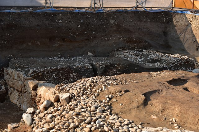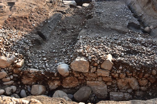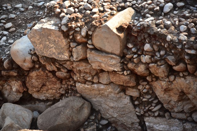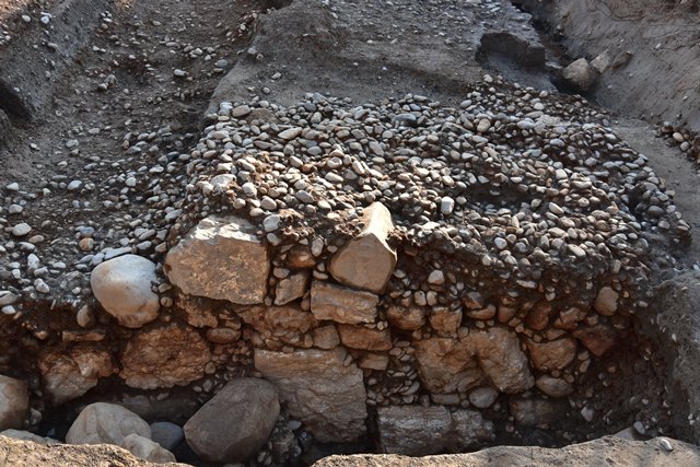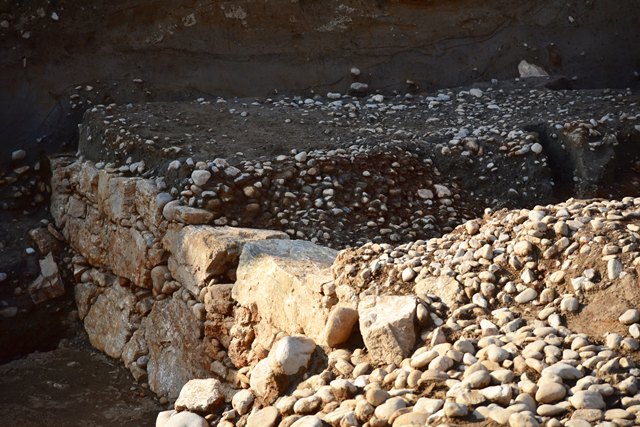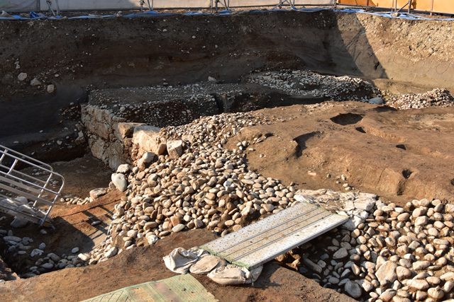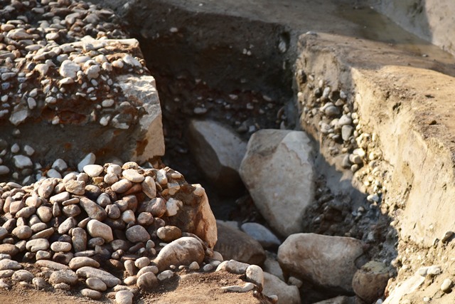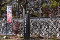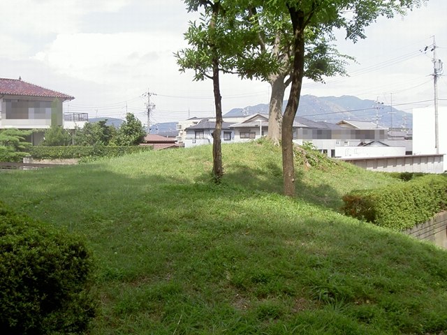 北野神社社殿左手から登るか、路地の途中の自治会が立てられた説明板のところから城山遊歩道を登ります。山頂が主郭のようですが明瞭な遺構は見当たりません。城址碑があるのみです。 麓の北野神社隣の社宅には居館の土塁の一部が残っていました。高さは3m程度あり、L字に残っていました。何か唐突な残り方ですが、この城の最大の遺構でしたが、その後、開発により消滅しました。城山そのものも南側が高速道路用の土砂取りで消滅しているとの事です。 2026年1月、居館跡の遺構が発見され、現説実施との情報でした。現説には行けませんでしたが、現地を確認に再訪しました所、現場には下りられませんが、道から石垣が見られました。幅5mほどの通路状の両サイドに石垣が発掘されてました。これは居館への土橋遺構との事です。土止めの石積みではなく、大きな石が使われ、見せる石垣である感じです。ここは今後埋め戻され道路になるとの事です。 |